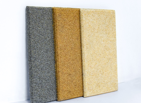微粒材料是一種新型綠色裝飾材料,具備優異的聲學性和物理性能。該材料是以天然砂?;蚪洯h保處理的固廢顆粒為骨料,以環保膠凝劑,通過壓振工藝,生產的具有大量相互連通的微小空隙的多孔材料。